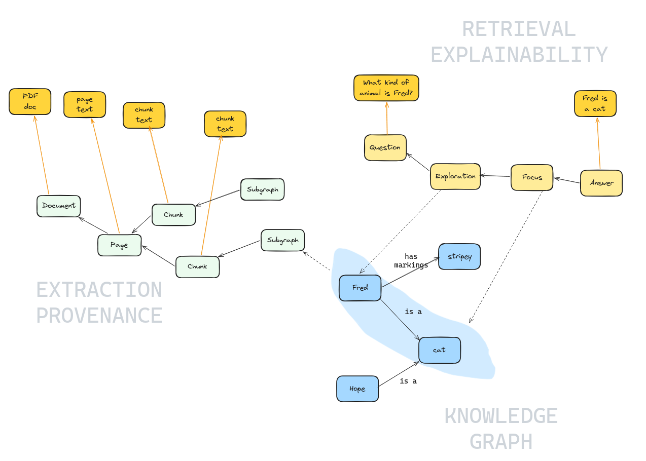 • Knowledge Graph (bottom right, blue) — the core entities and relationships extracted from chunks. In this example, Fred is a cat with stripey markings, and Hope is also a cat. The dashed line from a Chunk to the knowledge graph shows where extracted facts originated.